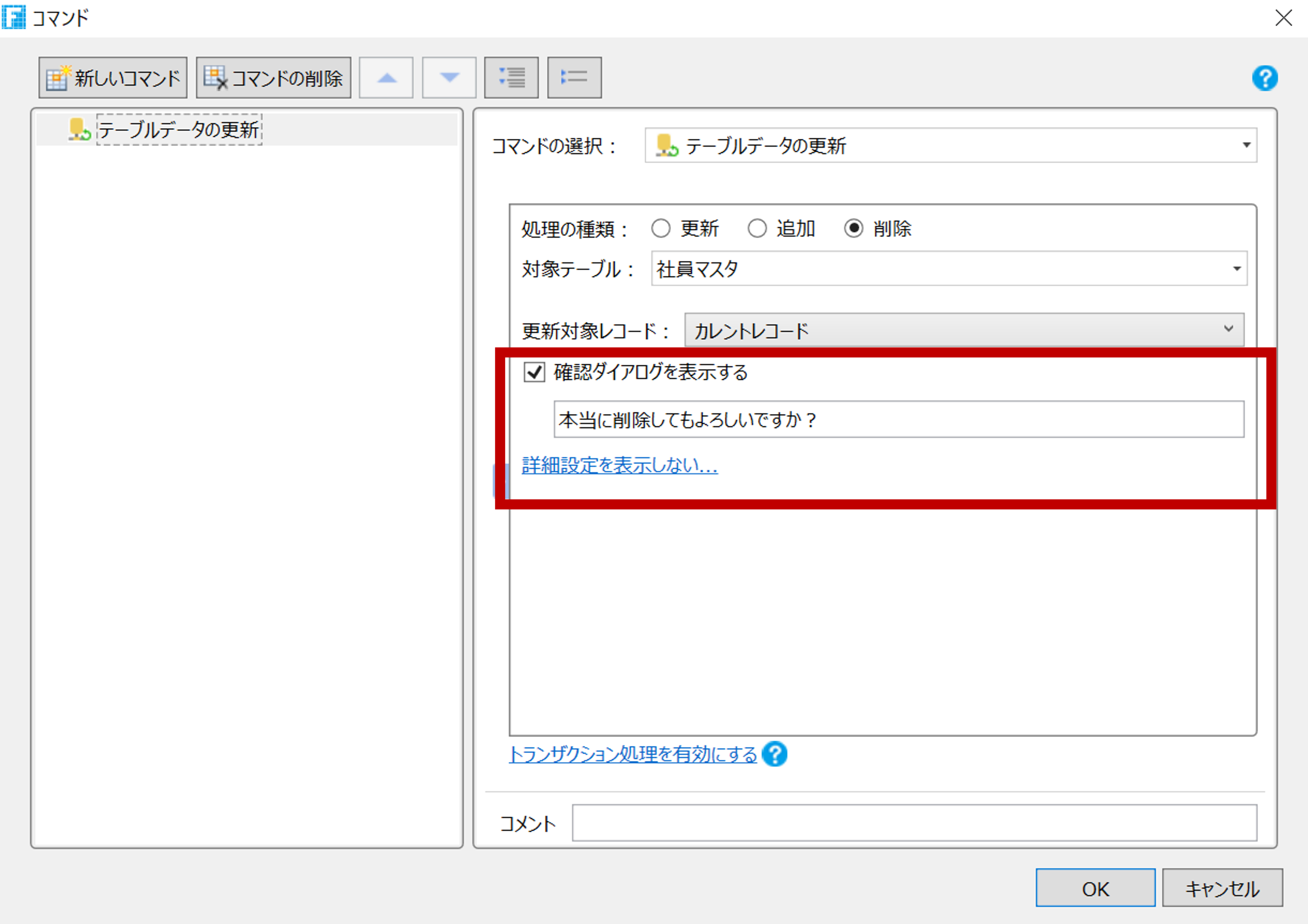 前述の通り、確認ダイアログはコマンドの「テーブルデータの更新」処理から設定できます(設定画面に項目が表示されていない場合、「詳細設定を表示」のリンクを押下してください)。表示するメッセージはデフォルトでセットされていますが、自由に変更することもできます。