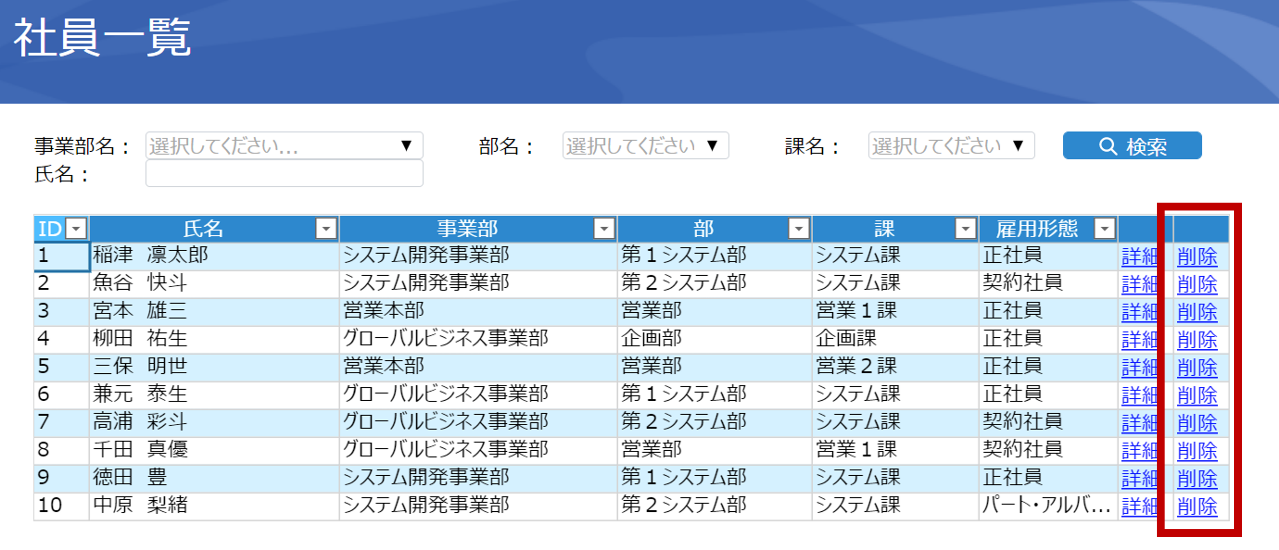 社員一覧画面の検索機能では、事業部名などの所属に関する情報はコンボボックスで実装しています。コンボボックスは組織マスタとデータ連携されており、組織マスタ内に存在する項目のみを表示します。一方で氏名はテキストボックスで実装し、ユーザーが自由に入力できるようにしています。こうすることで、図のように名前に「田」が含まれる人だけを抽出して表示するなど、検索の自由度を高めることが出来ます。もちろん、フルネームで指定を行うことも可能です。