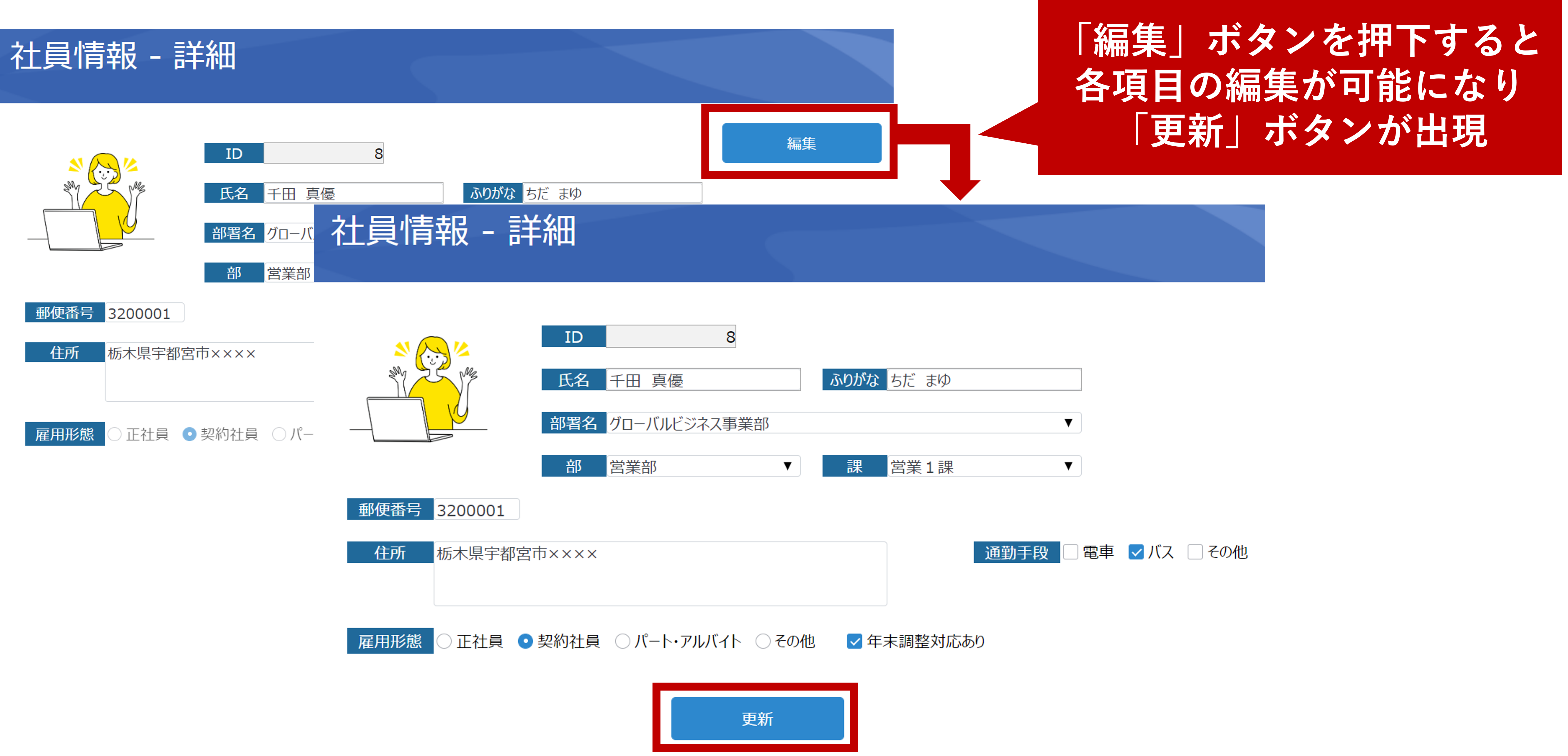 社員情報の更新は社員情報詳細画面から行います。社員一覧画面から「詳細」のリンクを押下すると選択した社員の詳細画面に遷移し、編集ボタンを押下することで各項目の編集・入力が可能になります。
