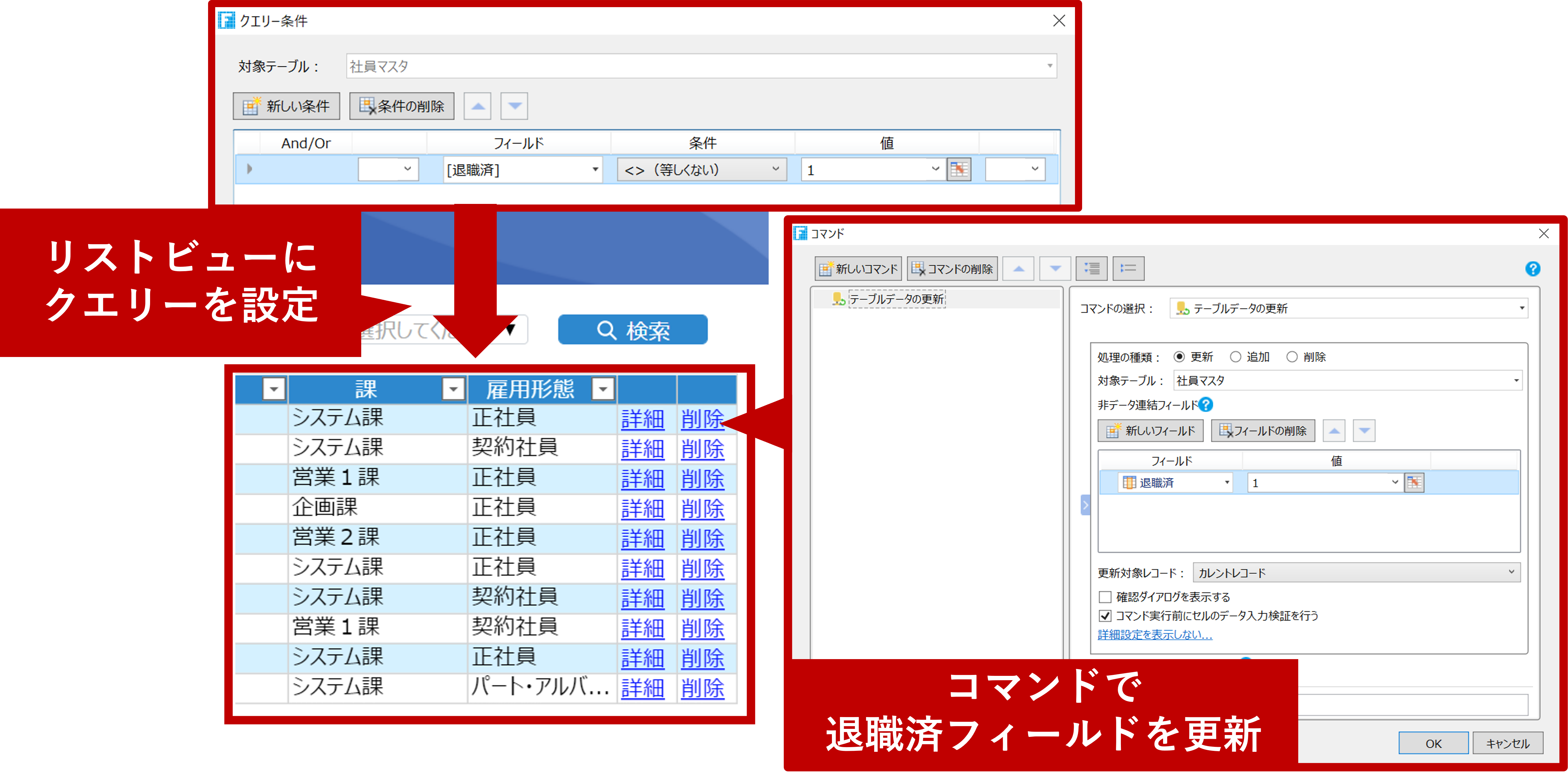 これを解決するにはあらかじめテーブルに状態フラグを用意しておくことが有効です。社員マスタにYes/No型の「退職済」というフィールドを準備しておき、社員一覧画面のリストビューにはクエリーで「退職済フィールドの値が1以外(=退職者でない)」という条件をセットします。そうすると、社員一覧画面には社員マスタに登録されていて、退職者ではない人の情報のみが一覧表示されるようになります。