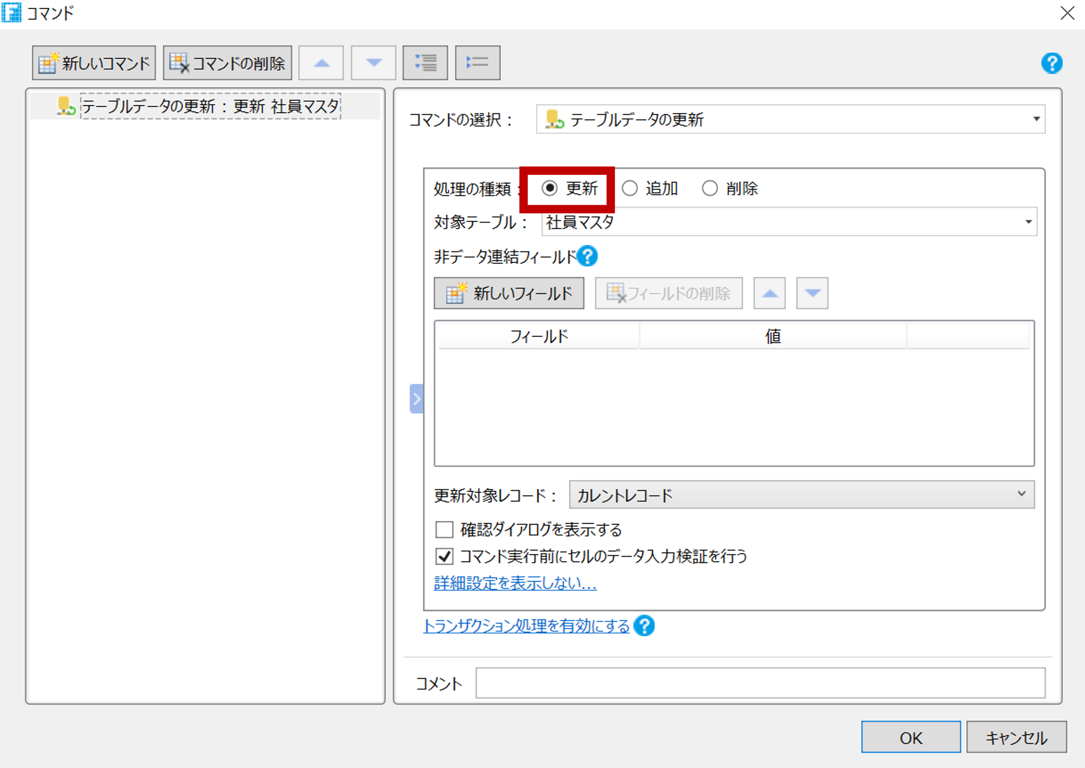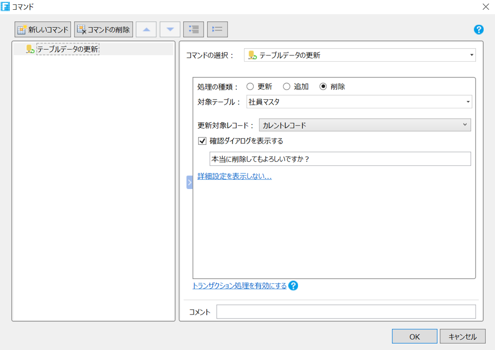 実際に1つのコマンドに対して複数テーブルのデータ操作を実装する場合には、トランザクション処理を有効にすることをおすすめします。トランザクションの設定も「テーブルデータの更新」処理内で有効/無効の切り替えができますので、ご活用ください。ただし、トランザクションはサーバーサイドのコマンドのみで使用可能です。