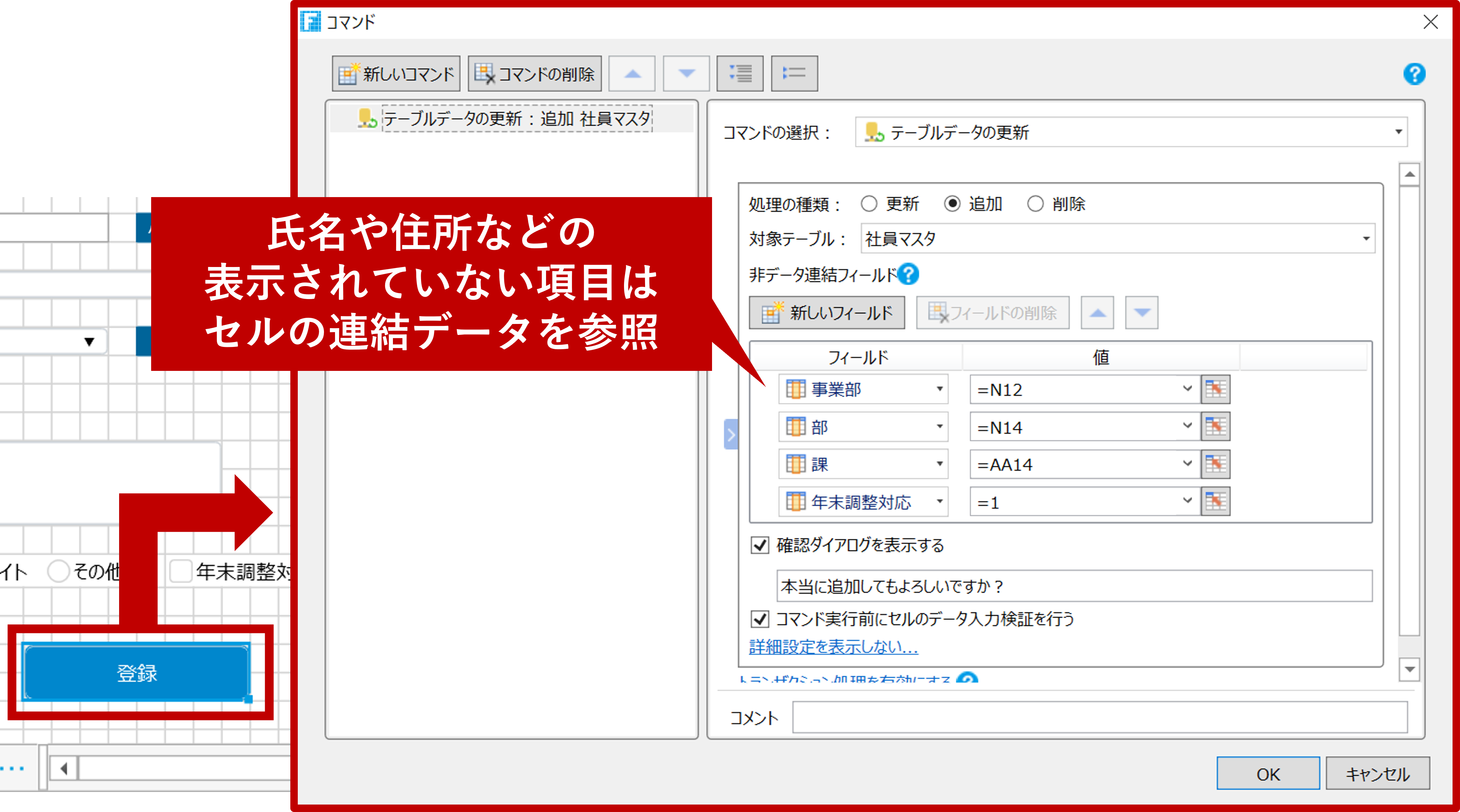登録処理は、登録ボタンにコマンドをセットして実装します。