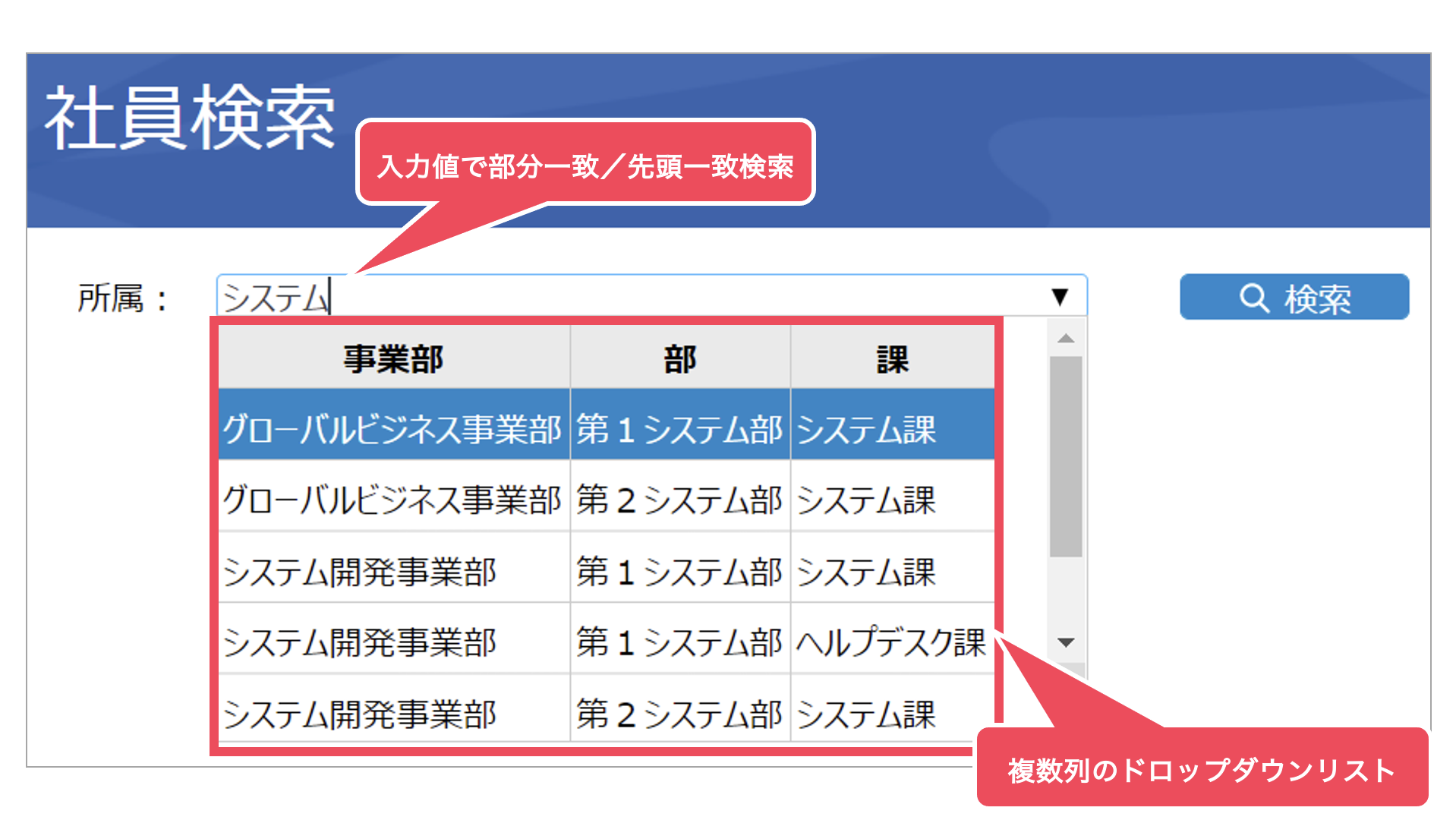 コンボボックスを使用すると、入力項目を既定のリストの中から選べるようになり、入力値の表記ゆれを防ぐことができます。入力項目を選ぶためのドロップダウンリストには、複数カラムで項目を表示することができます。