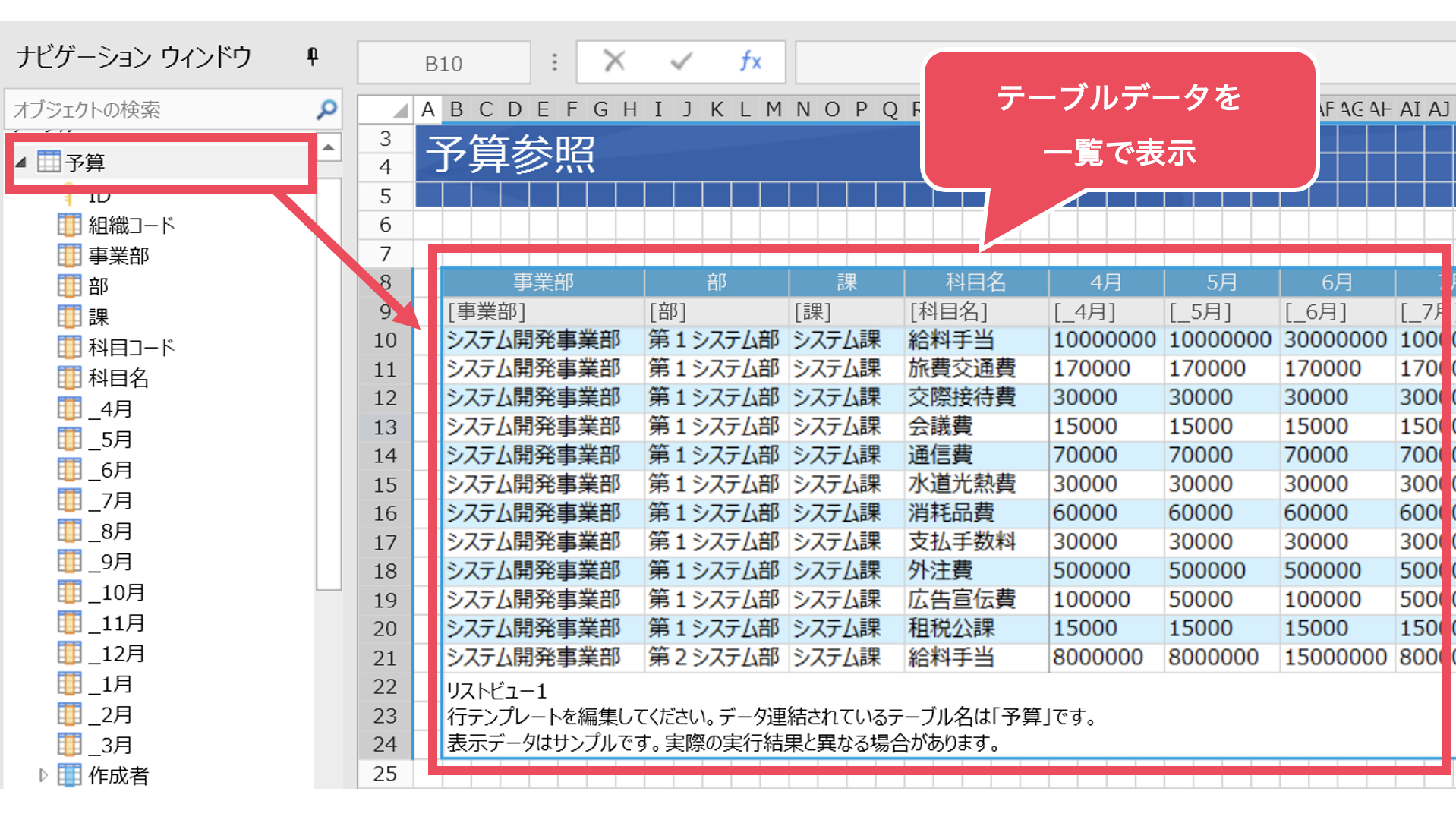 UI部品を使用して、データベース内のテーブルデータを一覧形式で表示します。表示する項目は、開発者が自由に指定できます。