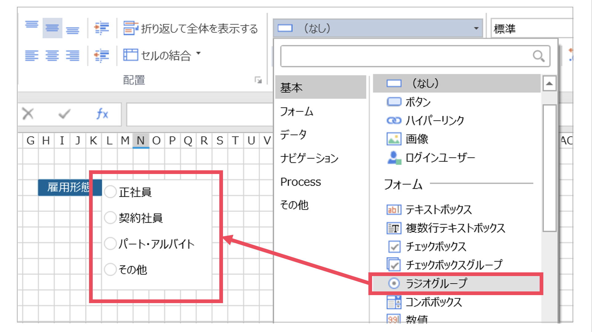 ラジオグループは複数のラジオボタンを1つのグループにまとめたものです。同じグループ内のボタンは同時に選択できないため、入力内容の矛盾を防ぐのに便利です。ラジオグループの配置も、セル型を変更して行います。