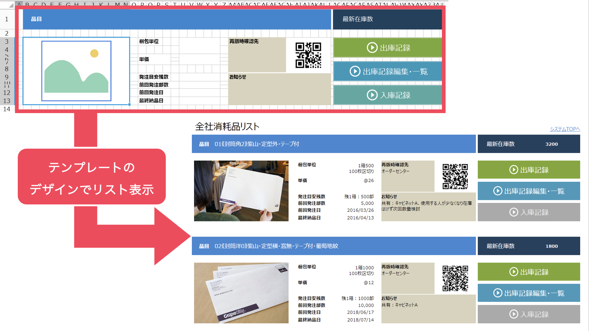 バーコード型のセルを使用すると、画面にバーコードを配置することができます。バーコード型セルではQRコード、NW7、CODE39、GS1-128、CODE128、JAN13、JapanesePostalといった種類のバーコードを生成できます。データ連結機能を使用すれば、データベース内のレコードを簡単にバーコードとして表示することができるので、部品の在庫管理表や発注票などの書類に印字することも容易に実現可能です。