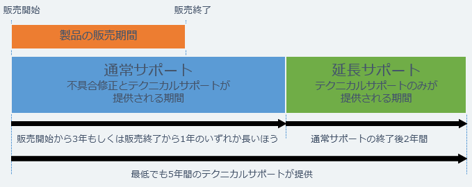 製品のテクニカルサポートと製品の不具合を修正した修正版(アップデート)の両方を提供する期間です。製品を販売している限り継続されます。製品の販売後は、販売開始から3年もしくは販売終了から1年のいずれか長いほうの期間まで提供されます。