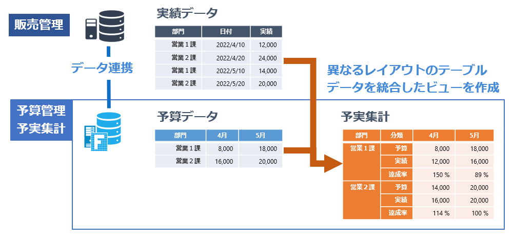 実績データのある販売管理等のシステムとデータを連結して手作業でのExcel転記は不要。予算と実績のデータレイアウトの違いもビューの機能でデータを整形できるので予実集計をシステムで自動化。