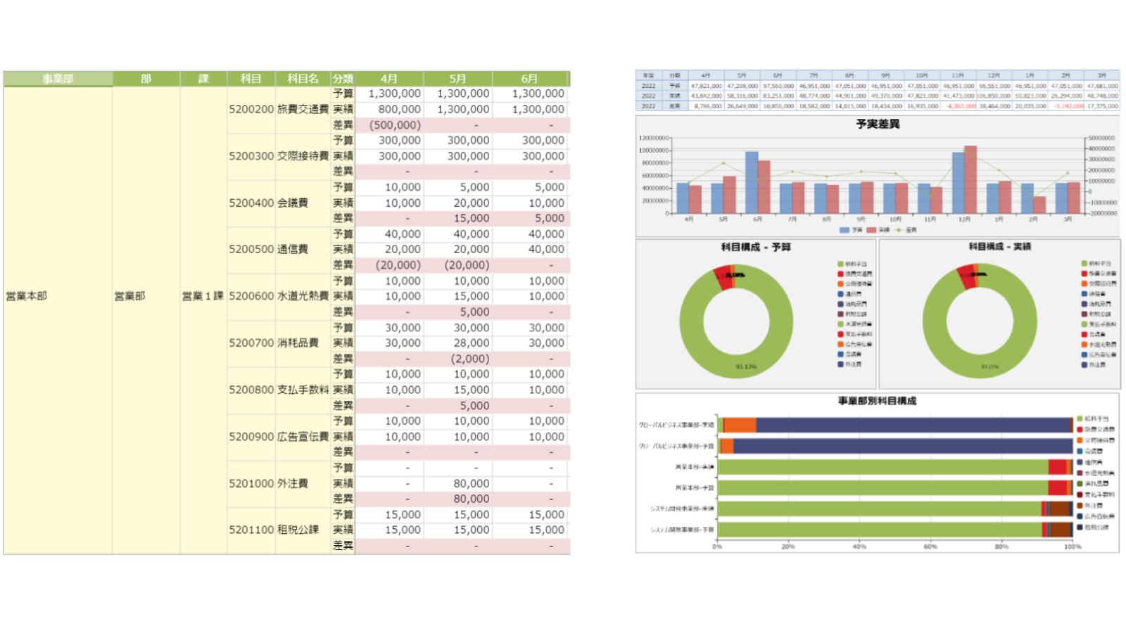 予実集計表以外にもグラフを使ったデータの可視化や、ピボットテーブルで部門や科目などの見たい切り口でデータを分析。リアルタイムの情報で経営指標を見える化し素早い経営判断に活用。