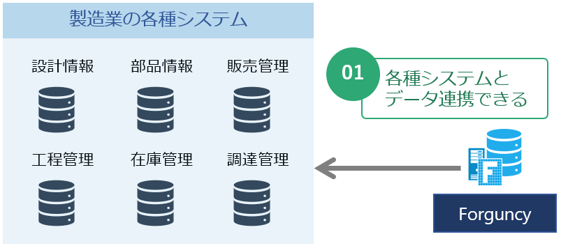 Forguncyはデータ連携機能を有しているため、バリューチェーン毎に分散したシステムのデータベースと連携して各種情報をForguncyに集約して活用が可能。