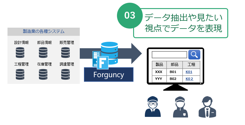 Forguncyは見たいデータを探すための検索機能や、見たい視点でデータを表現するための画面開発の機能が充実。販売終了が予定されている原材料を使っている製品を抽出したり、過去の製造情報の事例を探したりと、各現場が見たい情報を見やすく表現。